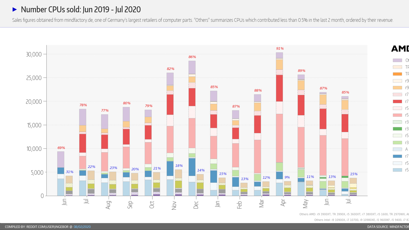 Компания AMD до сих пор занимает львиную долю в продажах магазина, хотя показатель понемногу снижается, начиная с апреля. Сейчас AMD удерживает 85% продаж, оставляя Intel лишь 15%. В денежном выражении соответствующие показатели составляют 81% и 19%.