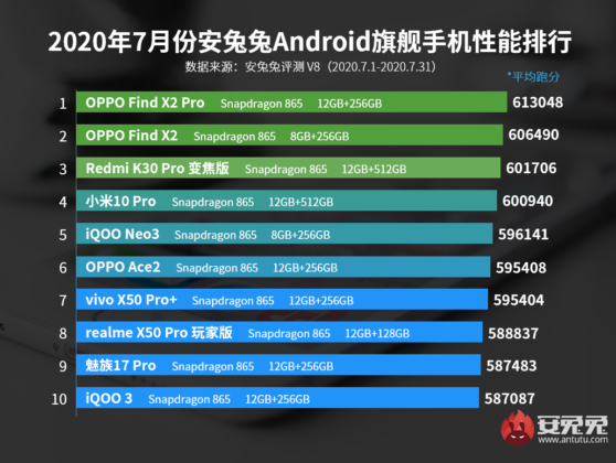 Первое место продолжает удерживать Oppo Find X2 Pro с результатом 613 048 баллов. Oppo Find X2 занимает второе место, набрав 606 490 баллов. Третье место досталось Redmi K30 Pro, который набрал 601 706 баллов.