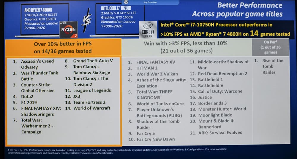 Intel в данном случае утверждает, что её решение опережает конкурента на величину от 7 до 37%. Если точнее, в 21 игре из 36 преимущество Core i7-10750H лежало в пределах 3-10%, а в 14 играх оно превышало 10%. При этом игры тестировались в Full HD, но мы не знаем настроек качества графики. Зато известно, что для тестов использовались ноутбуки Lenovo Legion Y7000 и R7000 с видеокартой GeForce GTX 1650 Ti.
