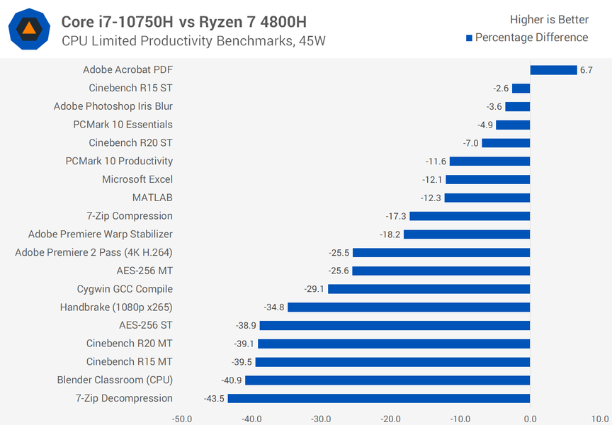 Таким образом, мы в очередной раз отчётливо видим, как Intel пытается найти варианты для того, чтобы выделить свои CPU на фоне решений AMD. Но чем дальше, чем всё более натянуто выглядят такие попытки, ибо в реальных задачах, где современные многоядерные CPU имеет смысл сравнивать, у Core i7-10750H на фоне Ryzen 7 4800H шансов нет. Это хорошо видно из полноценных сторонних тестов.
