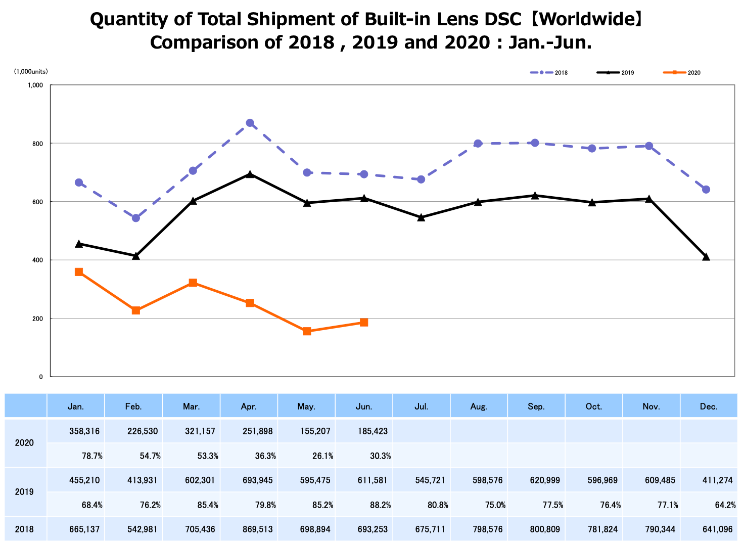 Продажи компактных камер сократились с 611 581 до 185 423 штук, то есть на 69,7%. Продажи камер со сменными объективами сократились с 640 866 до 326 094 штук, то есть на 49,1%. Сменных объективов сейчас продается примерно 1,79 штуки в расчете на одну проданную камеру (это среднее значение за первые шесть месяцев года).