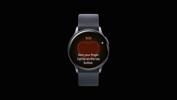 Функция мониторинга электрокардиограммы работает путем анализа электрической активности сердца с помощью датчика ЭКГ на Galaxy Watch Active2. Для того, чтобы ею воспользоваться, необходимо открыть приложение Samsung Health Monitor, сидя в удобном положении, и убедиться, что носимое устройство плотно прилегает к запястью. Затем расположить предплечье на плоской поверхности и удерживать кончик пальца противоположной руки на верхней кнопке Galaxy Watch Active2 в течение 30 секунд. В это время приложение измерит частоту сердечных сокращений и ритм, который будет классифицирован как синусовый ритм (нормальное, регулярное сердцебиение) или фибрилляция предсердий (сердце бьется нерегулярно)».
