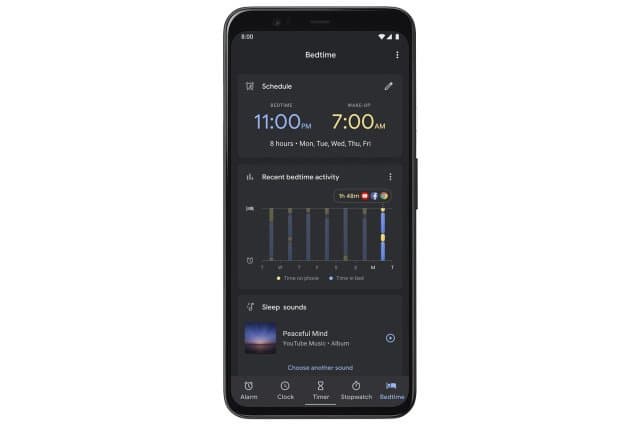 Bedtime доступен в виде вкладки в приложении «Часы» (Clock). В ней предлагаются несколько инструментов для улучшения сна, а также недавняя активность во время, отведённое на сон — сколько смартфон был включен, и так далее. Можно выбрать специальную успокаивающую музыку из разных источников, а также дать доступ к календарю, чтобы будильник срабатывал перед каждым мероприятием.