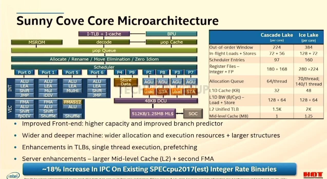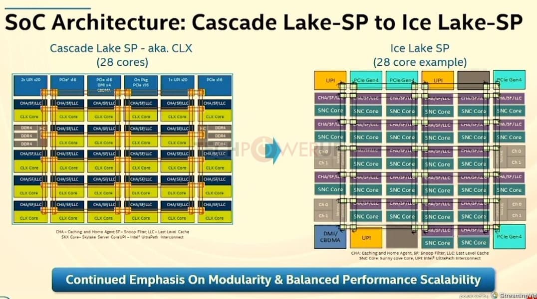 Компания Intel посвятила вступительную презентацию на виртуальной конференции Hot Chips 32 рассказу о процессоре Xeon Scalable следующего поколения, известному под кодовым наименованием Ice Lake-SP. Этот процессор, рассчитанный на выпуск по 10-нанометровому техпроцессу, представляет собой первое использование ядра Sunny Cove в процессорах корпоративного сегмента. Переход на Sunny Cove обеспечивает прирост показателя IPC по сравнению с ядром ?Skylake, которое Intel использует в микроархитектуре процессоров Xeon с 2015 года. Хотя реализация ?Sunny Cove для Xeon мало отличается от реализации для мобильных процессоров Ice Lake-U 10-го поколения, она учитывает иерархию кэш-памяти и топологию кристаллов, принятую для процессоров Intel корпоративного сегмента.