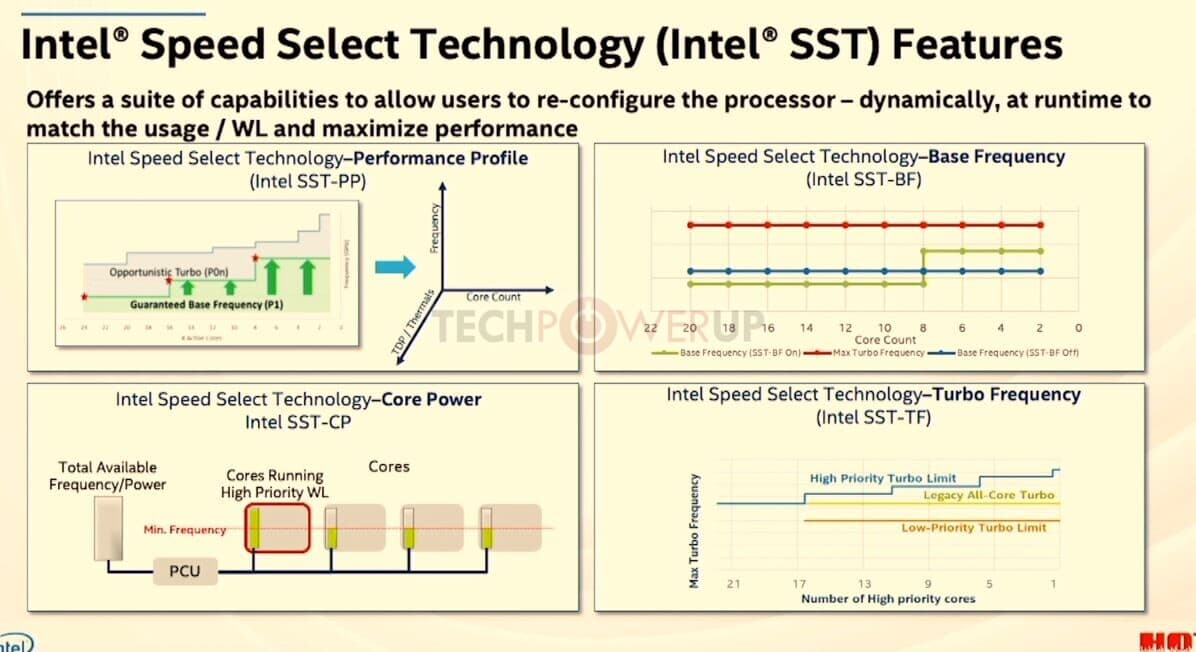 Интересным новшеством является технология Intel Speed ??Select. Она позволяет администраторам отключать ядра процессора и тратить бюджет TDP на повышение частоты оставшихся ядер. Эта же функция используется для отключения ядер с целью снижения энергопотребления сервера.