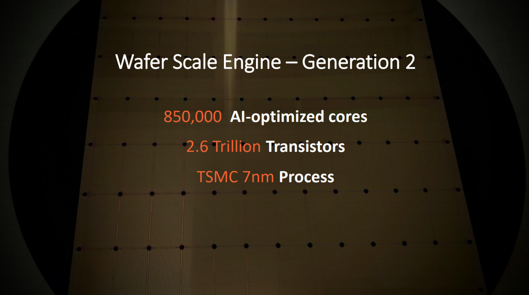 Итак, Cerebras Wafer Scale Engine второго поколения содержит 850 000 ядер (у первого поколения 400 000 ядер), состоит из 2,6 трлн транзисторов и будет производиться по техпроцессу 7 нм (против 16 нм у текущей модели).