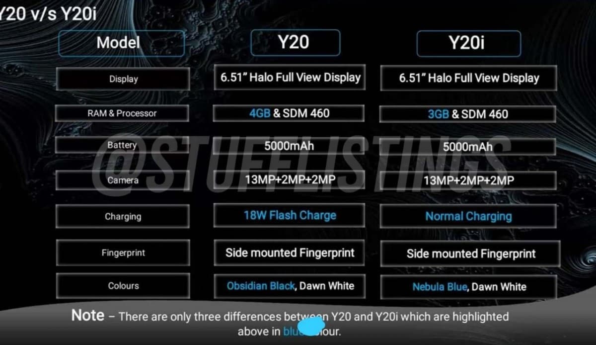 Различия сводятся к цветовой гамме, мощности зарядки и объему оперативной памяти. Так, Y20 имеет 4 ГБ ОЗУ, поддерживает 18-ваттную зарядку и предложен в черном и белом цветах. Y20i, в свою очередь, заряжается «на нормальной скорости» (скорее всего, мощность ограничена 10 Вт), имеет 3 ГБ ОЗУ и представлен в синем и белом.