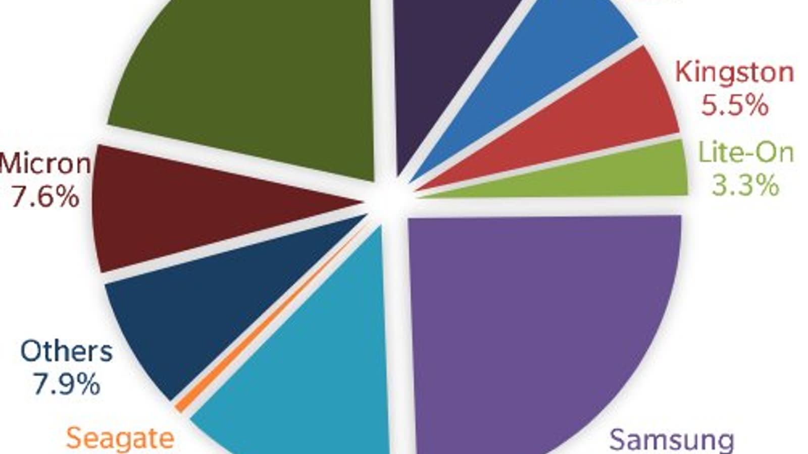 Переход к подсчетам в единицах информационного объема еще более явно выводит Samsung на первое место. На накопители южнокорейского производителя, выпущенные в течение квартала, приходится 31,1% всех поставок. Доля WDC — 18,6%.