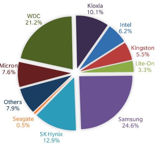 На рынке SSD с большим отрывом лидируют Samsung и WDC. Как видно на диаграмме, они занимают 24,6% и 21,2% соответственно, то есть суммарно почти половину рынка, если учитывать количество отгруженных накопителей.