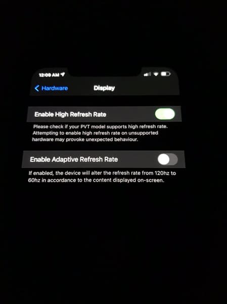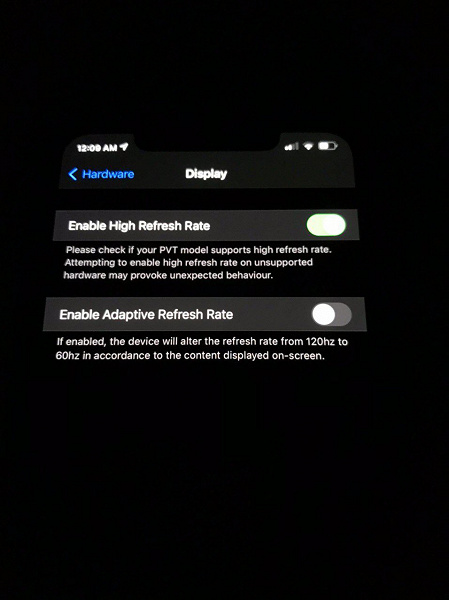 Что касается первой картинки, то на ней четко виден вырез и два режима обновления экрана iPhone 12 Pro Max: в первом случае – 120 Гц, во втором адаптивном – от 120 до 60 Гц.
