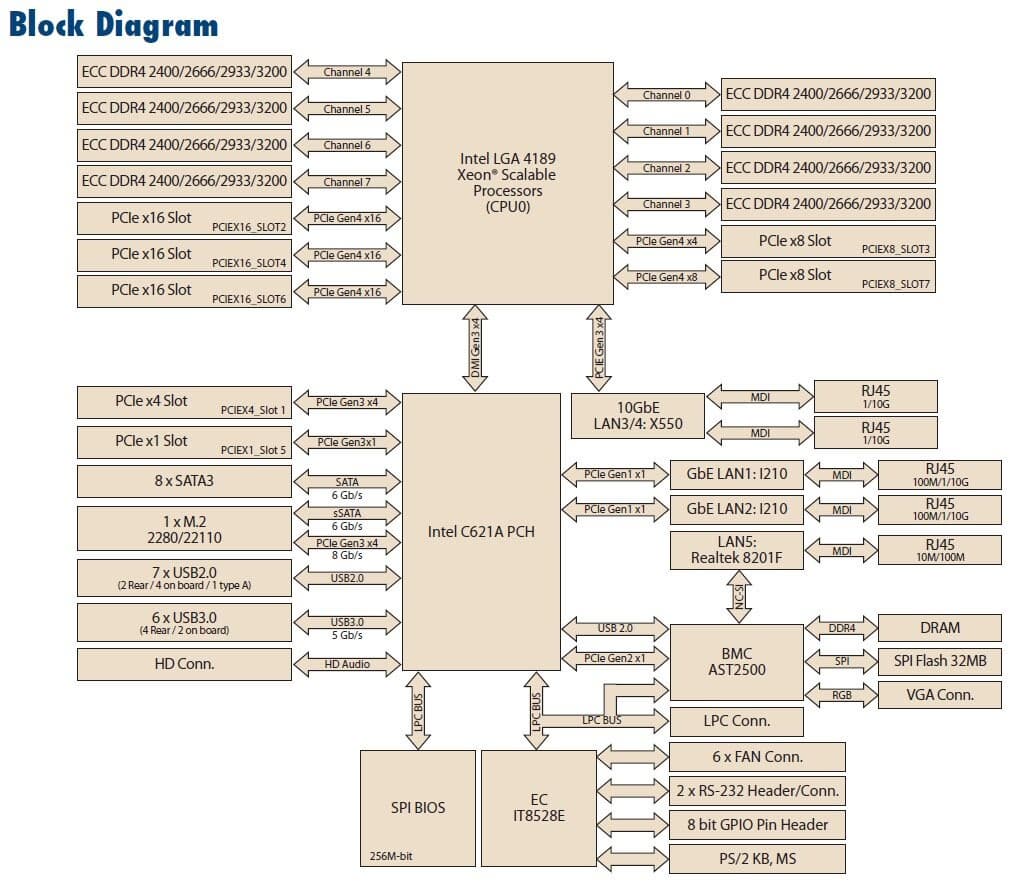 Другой ключевой компонент платформы — Intel C621A PCH. Он взаимодействует с процессором Ice Lake-SP по каналу PCI-Express 3.0 x4 и, по-видимому, унаследовав структуру Gen 3.0 от C621 более старого поколения. По предварительным данным, 10=нанометровые процессоры Ice Lake-SP будут иметь TDP до 270 Вт.