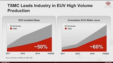 Учитывая, что производительность машин разнится и не все они используются для серийного производства, на долю TSMC приходится 60% мощностей для EUV, если считать по количеству пластин, обрабатываемых в единицу времени.