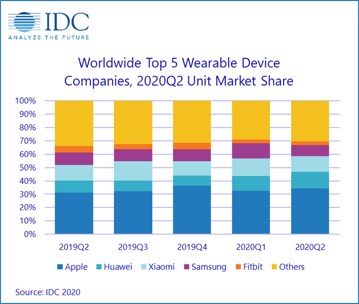 Лидером по итогам квартала является компания Apple. Ее доля за год увеличилась с 31,1% до 34,2%. Второе место занимает компания Huawei, которая за год смогла увеличить свою долю с 9,1% до 12,6%. Доля компании Xiaomi, занимающей третье место, за год не изменилась и составляет 11,8%. Четвертая по размеру доля рынка — 8,3% — принадлежит компании Samsung, в прошлом году занимавшей 9,4% рынка, а замыкает первую пятерку компания Fitbit, доля которой за год сократилась с 4,6% до 2,9%.