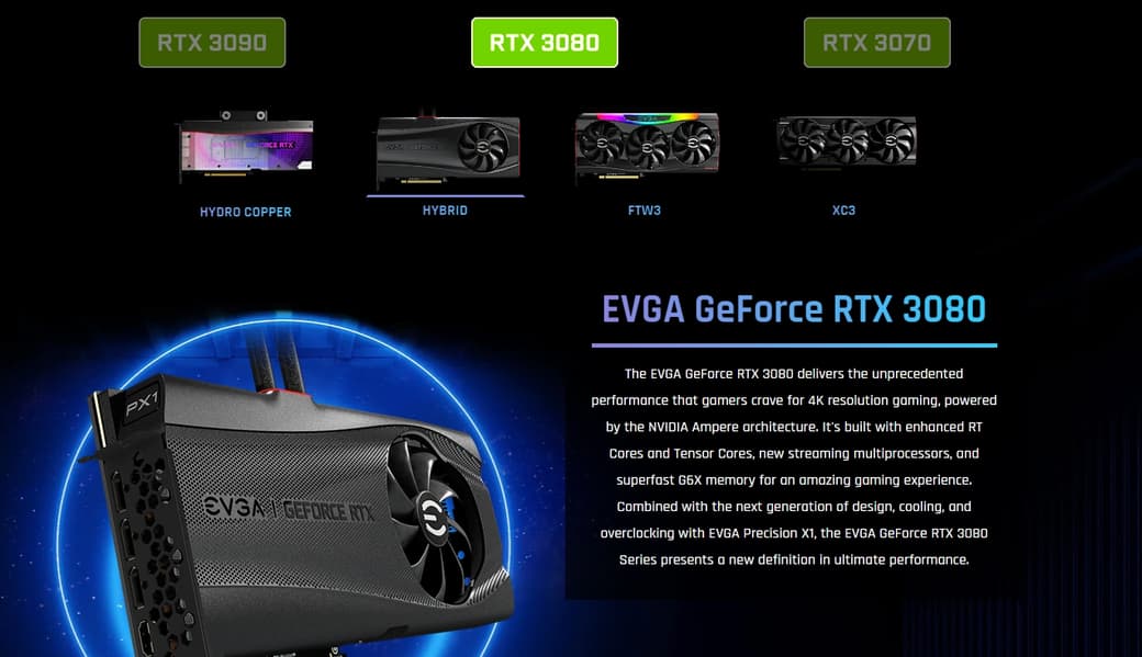 Также можно видеть, что EVGA решила не ограничиваться моделями с воздушным охлаждением и представила карты Hydro Copper с водоблоком, а также модели Hybrid и Kingpin с гибридными охладителями.