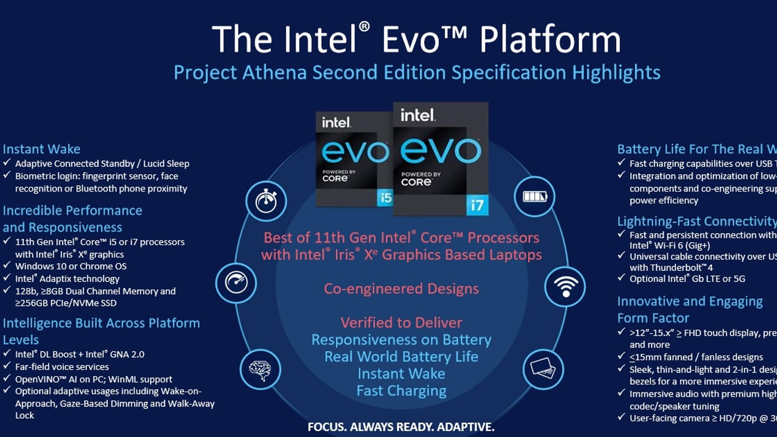 Вместе с процессорами компания представила Intel Evo — платформу и бренд для ноутбуков, разработанных и верифицированных в рамках «инновационной программы» Project Athena. Как сказано в пресс-релизе, мобильные ПК, созданные в рамках новой платформы, оснащены процессорами Core 11-го поколения с графикой и соответствуют второй редакции спецификаций и ключевых показателей пользовательского опыта программы Project Athena. Кроме того, ко второму году развития программы процесс верификации получил более строгую и наглядную методологию тестирования на основе выполнения реальных повседневных задач.