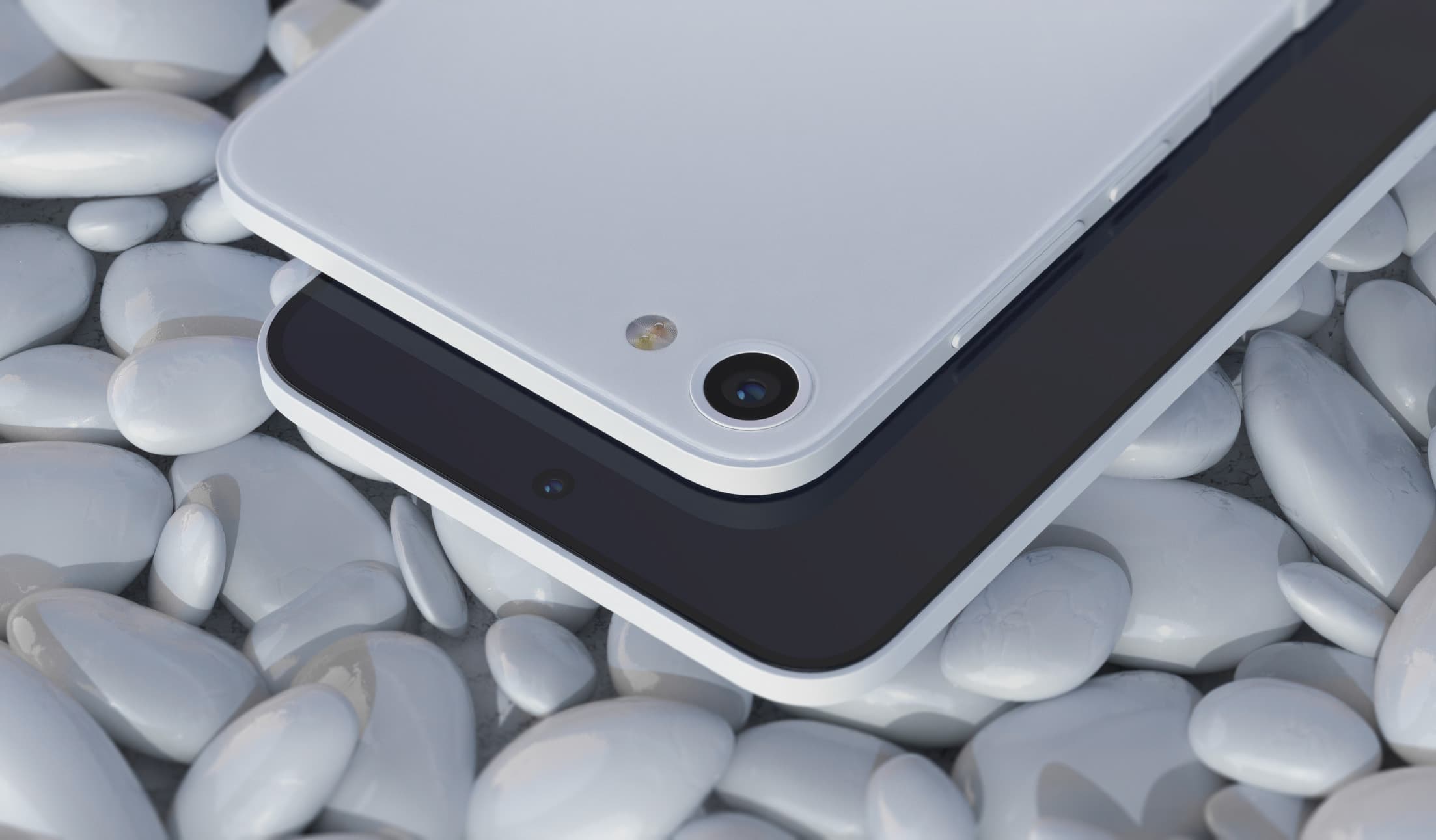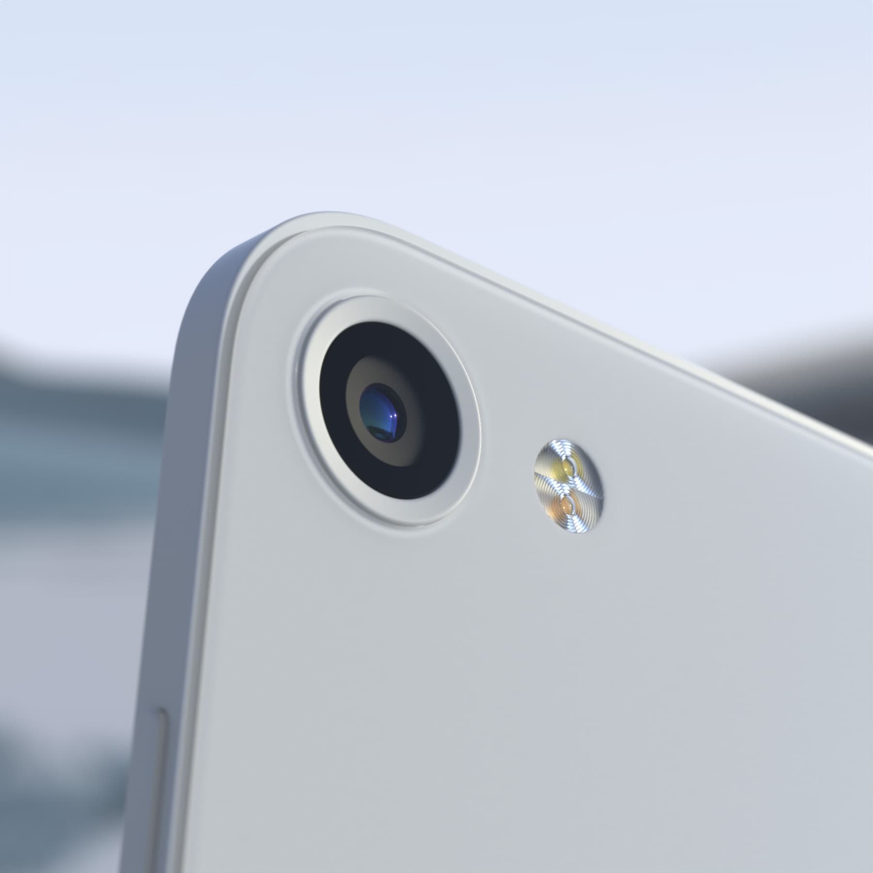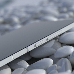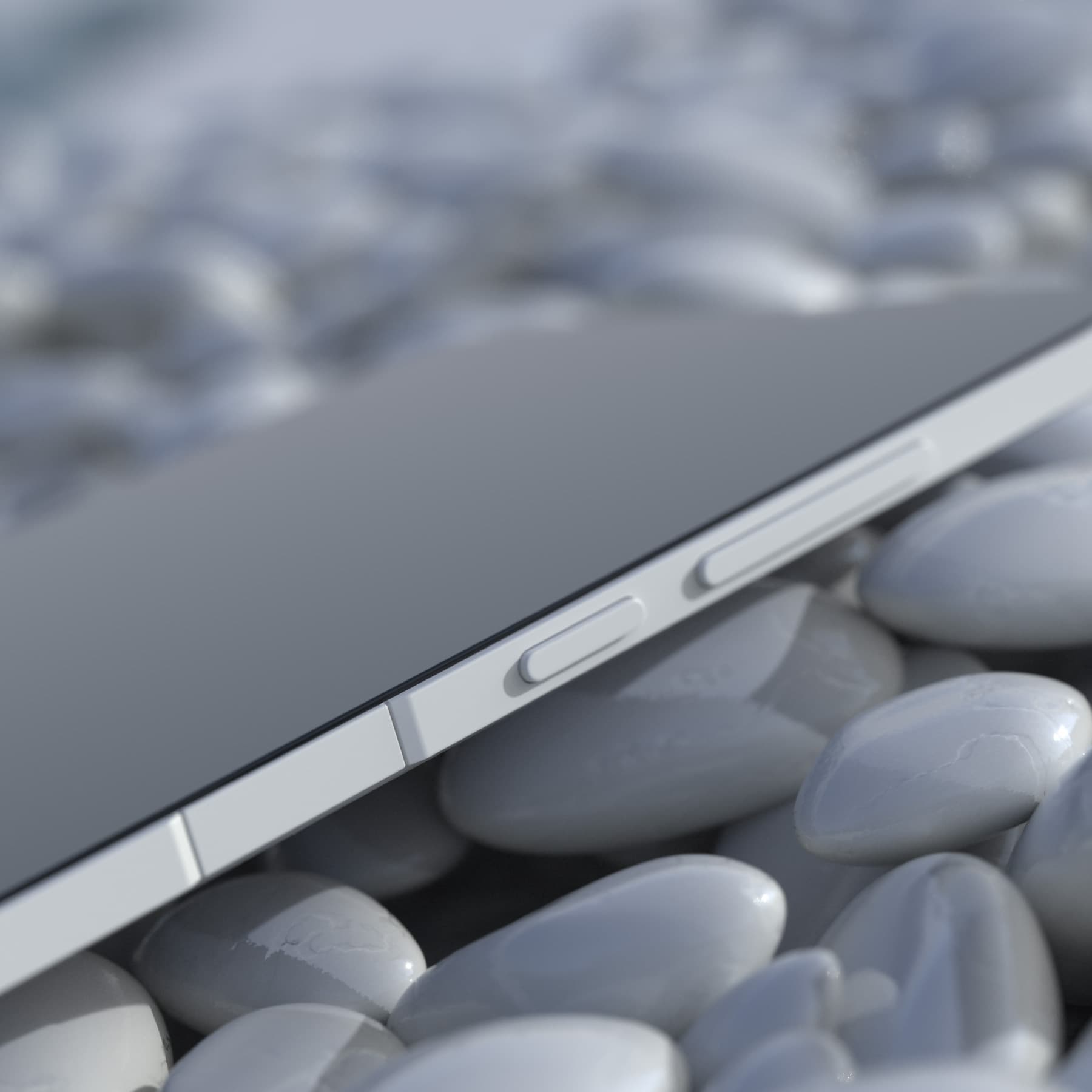 Концепт дизайнера выделяется очень тонкими и при этом одинаковыми со всех сторон рамками, ровными боковыми гранями с размещённым на одной из них сканером отпечатков пальцев, а также белым цветом.