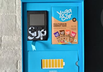 Приглашение содержит энергетические батончики и портативную игровую консоль с ретро-играми