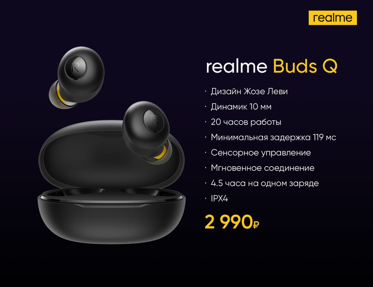 Китайская компания Realme представила сегодня в России не только Realme С15 с аккумулятором ёмкостью 6000 мА·ч и Realme 6s 90-герцевым экраном, но и беспроводные наушники Realme Buds Q.