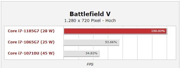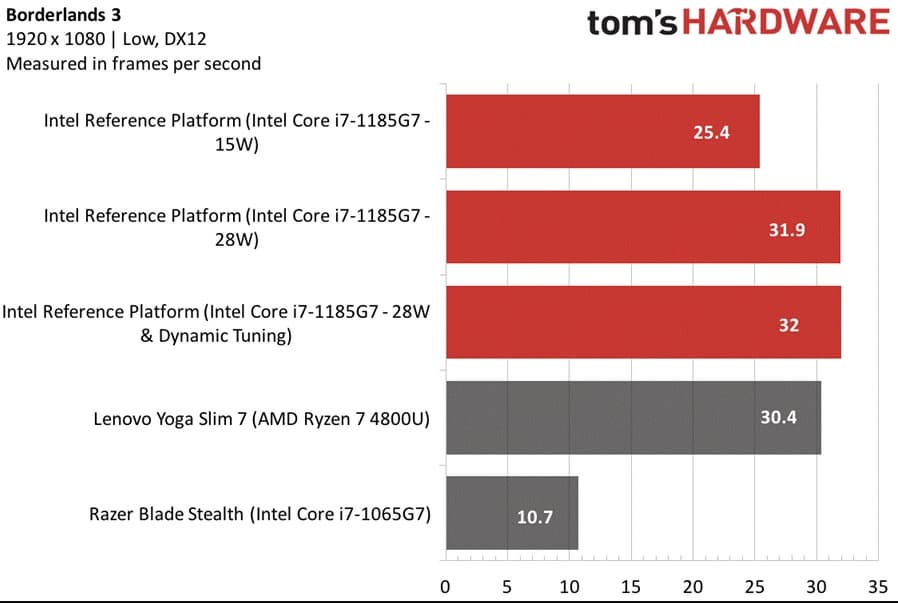 Что же касается производительности GPU, в 28-ваттном режиме топовое ядро Xe показывает себя великолепно, обходя Vega 8 в Ryzen 7 4800U на 20-40% в зависимости от игры (хотя есть игры, где разницы почти нет). Но при снижении лимита мощности до 15 Вт преимущество Xe исчезает и Vega 8 немного вырывается вперёд. Впрочем, сравнение с тем же Core i7-1065G7 показывает двукратный прирост в 15-ваттном режиме, а в 28-ваттном режиме новинка быстрее уже в три раза! Учитывая, что Ice Lake — это предыдущее поколение мобильных процессоров Intel, которое имеет тот же техпроцесс, это феноменальный результат.