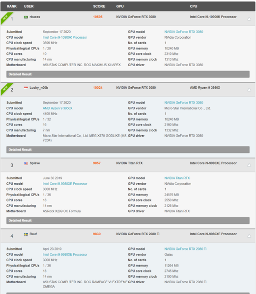 На первом месте Time Spy Extreme Hall Of Fame обосновалась GALX GeForce RTX 3080 SG, разогнанная до 2310 МГц. С результатом 10 595 баллов она возглавила рейтинг бенчмарка. Это примерно на 7% больше результата GeForce RTX 2080 Ti, разогнанной до 2745 МГц.