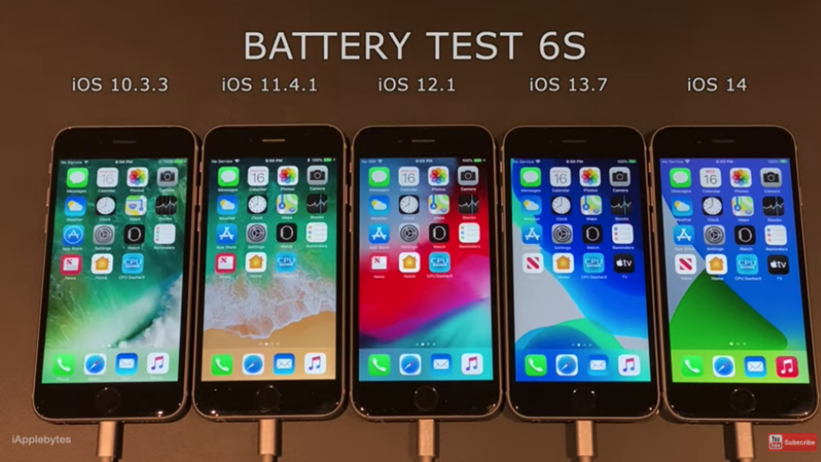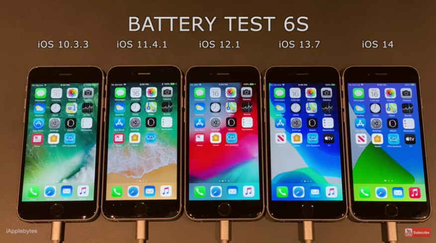 Ролик опубликовали на канале YouTube под названием iAppleBytes. На видео сравнивается время автономной работы iPhone 6s с установленными iOS 14 to iOS 13.7, 12.1, 11.4.1 и 10.3.3. Все смартфоны были заряжены на 100% в начале теста, отключена автоматическая настройка яркости, яркость установлена на 25%. Состояние аккумуляторов тоже было оптимальным — максимальная ёмкость у всех устройств составляла 100%.