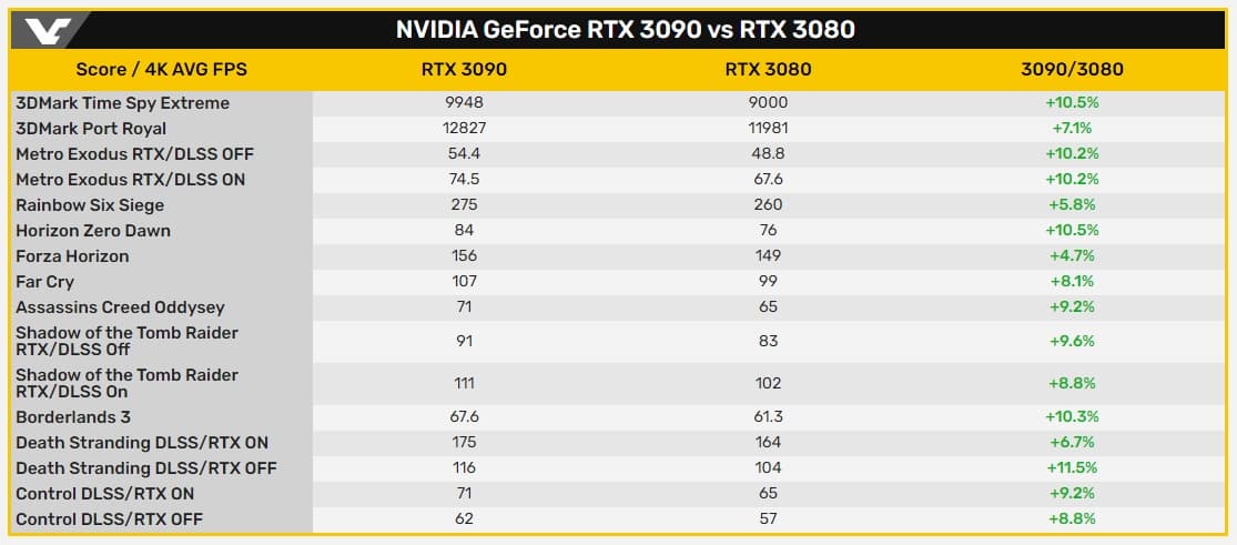 Напомним, RTX 3090 стоит вдвое больше RTX 3080, и никто, само собой, и не надеялся на соответствующий прирост производительности. Но насколько же всё-таки старшая карта быстрее?