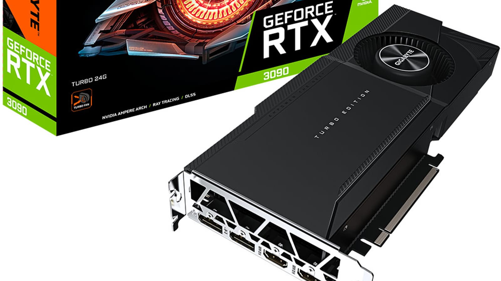 В каталоге Gigabyte появилась первая (и пока единственная) видеокарта серии GeForce RTX 30 с системой охлаждения, в которой воздух выдувается наружу центробежным вентилятором, который в просторечии некорректно называют «турбиной». Карта основана на GPU GeForce RTX 3090 и носит каталожный номер GV-N3090TURBO-24GD. Она характеризуется TDP 350 Вт.