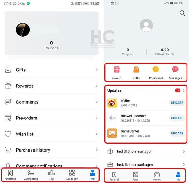 Вкладка Manager (Управление) раньше использовалась для управления установленными приложениями и проверки обновлений. Теперь она убрана. Функции управления с вкладки перемещены в секцию в профиле, а подарки, награды и комментарии — над разделом с обновлениями.