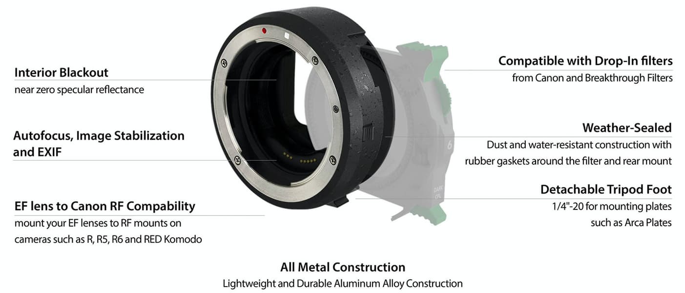 Особенностью адаптера является наличие слота для фильтра. У Canon есть подобный переходник, но Breakthrough EF-RF Drop-In Filter Adapter — первый адаптер с возможностью установки фильтра, предложенный сторонним производителем. Кстати, он совместим не только с фильтрами производства Breakthrough, но и с фирменными фильтрами Canon.