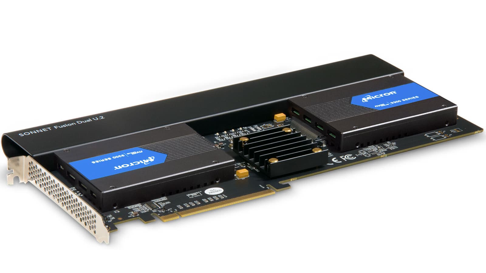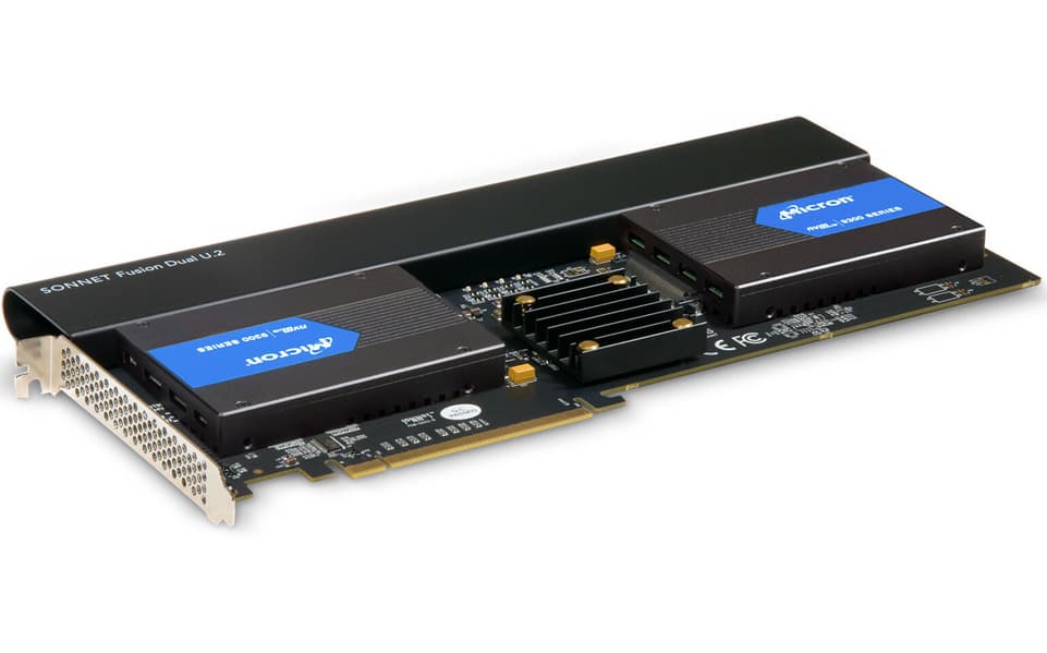 Ассортимент Sonnet Technologies пополнила необычная и пока единственная в своем роде карта расширения Fusion Dual U.2 SSD PCIe Card (FUS-U2-2X4-E3). Она обеспечивает подключение двух твердотельных накопителей типоразмера U.2 к слоту PCIe, при этом накопители монтируются непосредственно на карте.