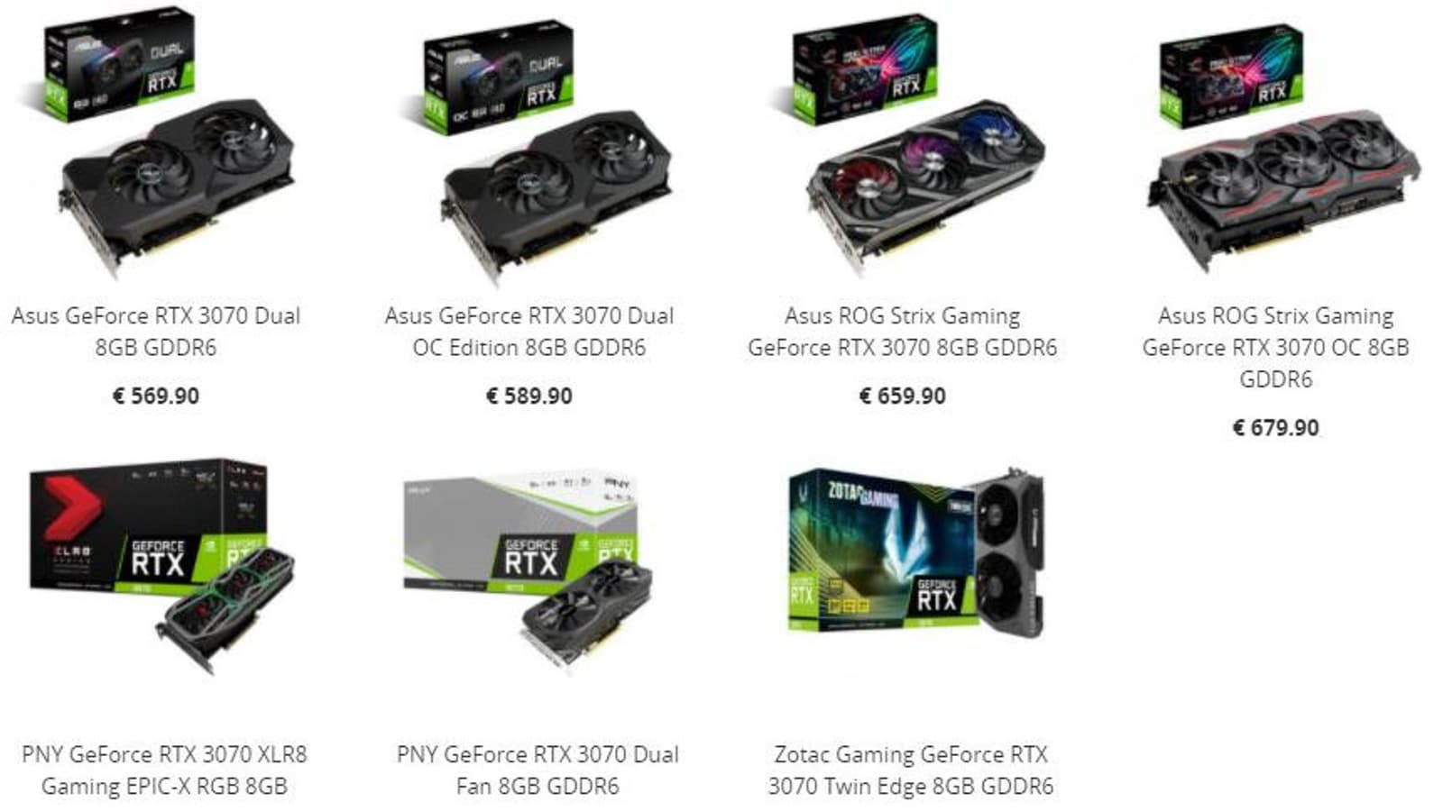 В продаже RTX 3070 появится уже 15 октября, и пока неясно, ждёт ли её судьба старшей модели. Но зато ясно, что цены уже сейчас зачастую весьма далеки от рекомендованных. Одна из испанских компаний добавила множество таких адаптеров в свой ассортимент, и цены на многие модели существенно превышают 550 евро, доходя до 680 евро. Минимальная цена — 520 евро за карты Zotac.