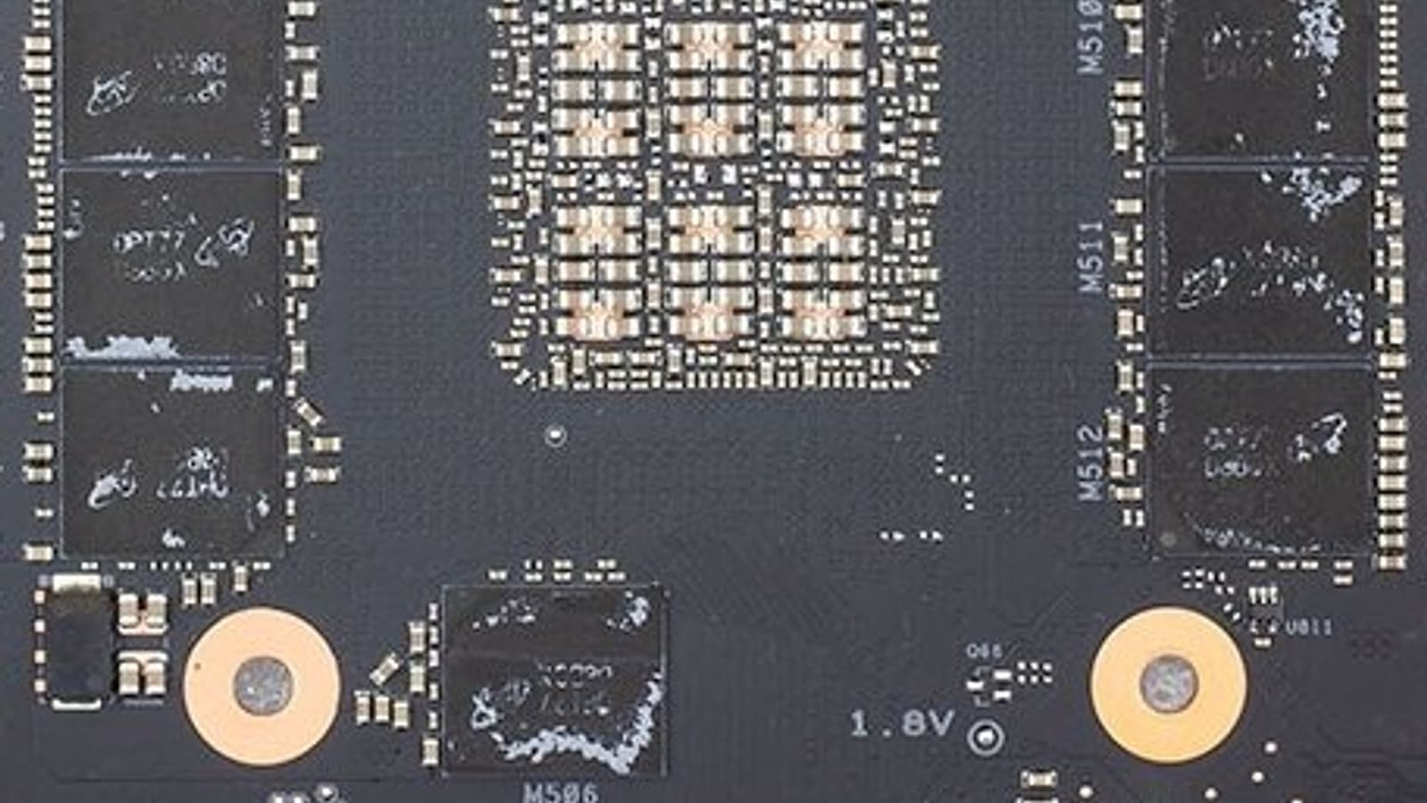 На сравнительном фото выше вы можете видеть обратную сторону печатной платы сразу за GPU. И хорошо видно основное отличие. Согласно спецификациям, в этом месте должно размещаться шесть конденсаторов для фильтрации высоких частот на шинах напряжения (NVVDD и MSVDD). И Nvidia разрешает использовать в этом месте как более дорогие керамические конденсаторы MLCC, так и более доступные танталовые POSCAP. При этом первые для имеющихся целей подходят лучше.