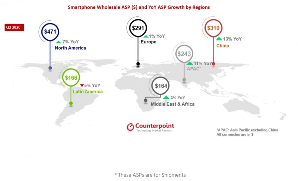 Самый большой рост средней цены зарегистрирован в Китае — на 13% до 310 долларов. В Северной Америке средняя цена выросла на 7% до 471 доллара, это самый высокий уровень средней стоимости смартфонов среди регионов. А вот в Латинской Америке цена упала на 5% до 166 долларов.