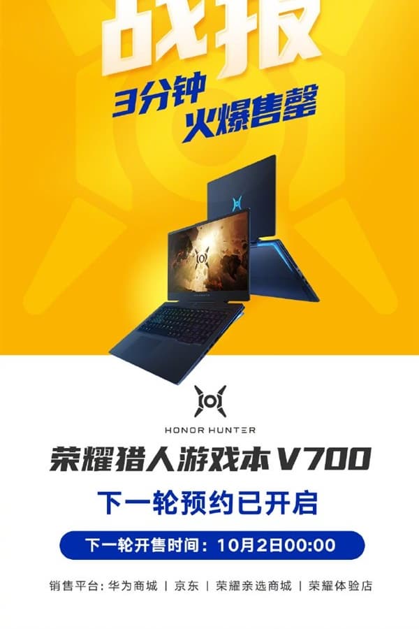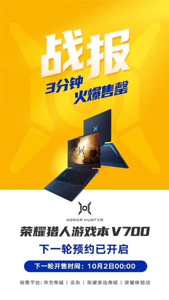 По официальному сообщению Honor, все Hunter V700 разошлись за 3 минуты. Следующая партия ноутбуков поступит в продажу в Китае 2 октября. В компании не раскрывают объем первой партии, но обычно, если речь идет о мобильных ПК, он составляет около 10 000 штук.