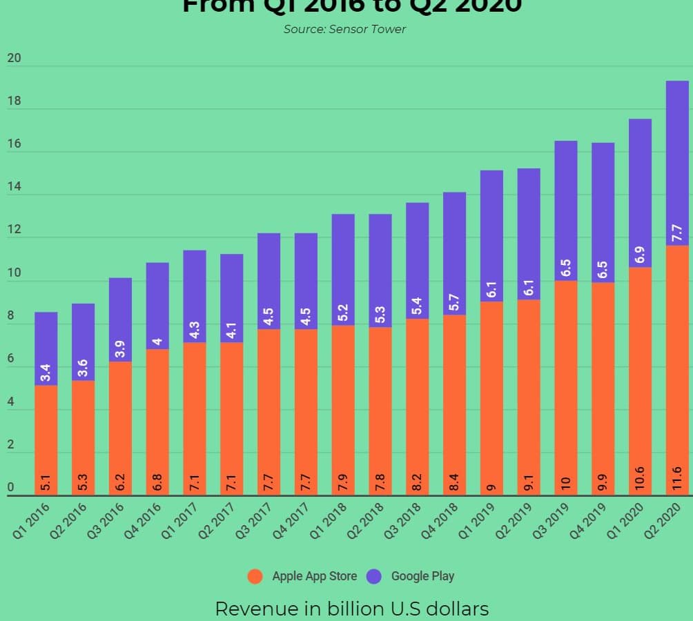 В первом квартале 2020 года общее количество загрузок составило 13,4 млрд, что на 20,7% больше по сравнению с предыдущим кварталом и на 39% больше по сравнению с аналогичным периодом прошлого года. Расходы игроков в этот период росли немного медленнее — на 6,6% в квартальном выражении и на 16% — в годовом. В денежном выражении рынок составил 17,5 млрд долларов.