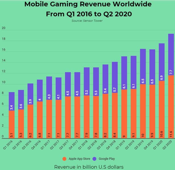 Во втором квартале количество загрузок мобильных игр и доход выросли до рекордно высокого уровня. По данным AppAnnie, загрузки мобильных игр во втором квартале увеличились на 12,2% по сравнению с предыдущим кварталом и на 44,4% в годовом выражении, превысив 15 млрд. В апреле 2020 года было зарегистрировано наибольшее количество загрузок за месяц — 5,5 млрд.