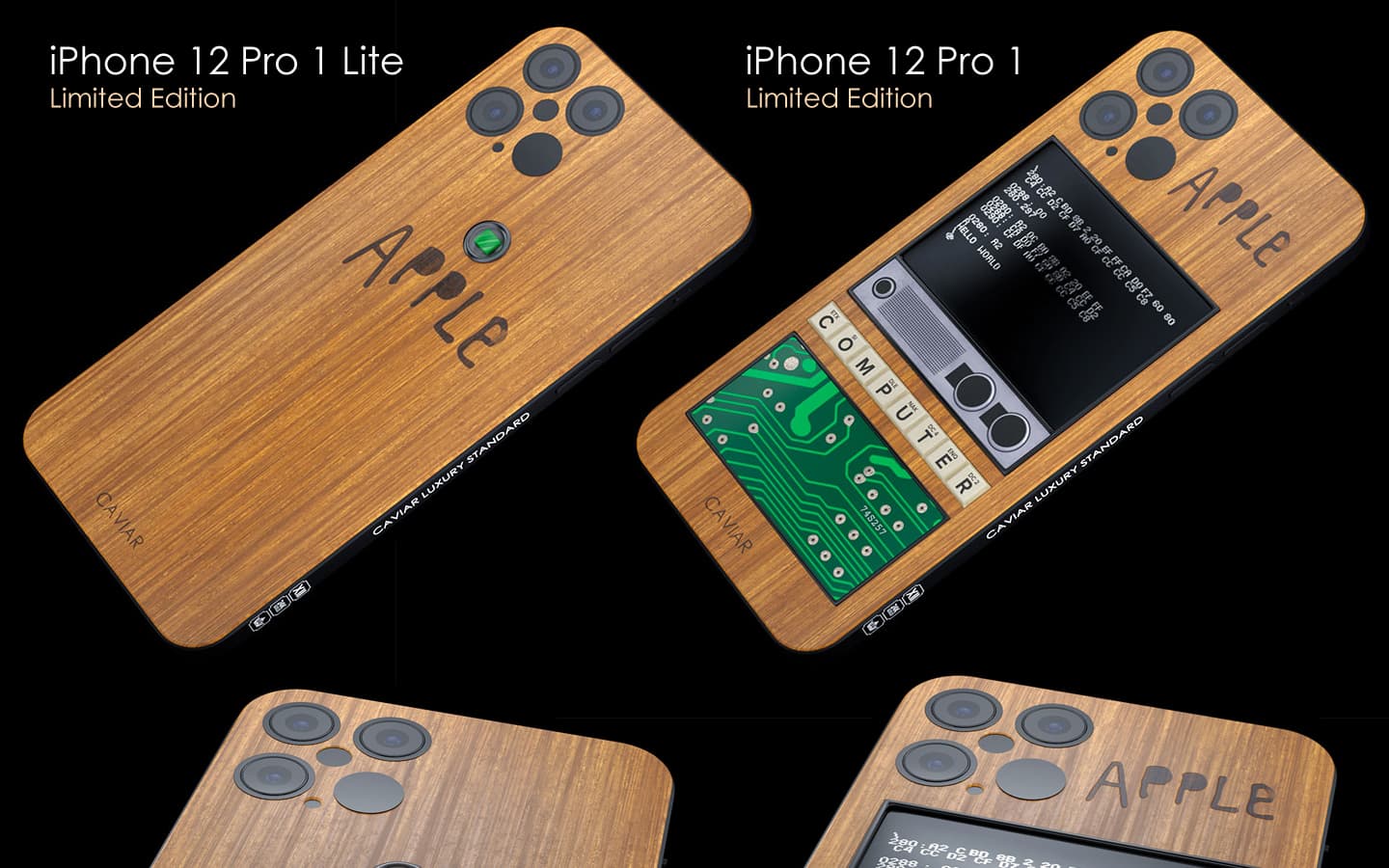 Компьютер Apple 1 был выпущен в 1976 году, он получил деревянный корпус и смешной логотип Apple. Caviar взяла за основу эти дизайнерские элементы при создании iPhone 12 Pro Apple 1 Edition.