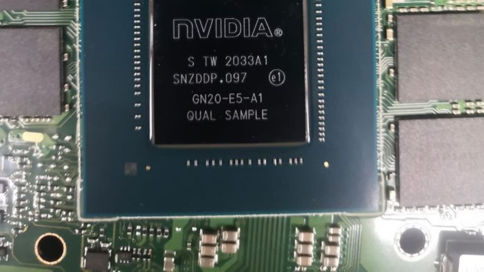 На фото ниже — квалификационный образец мобильной видеокарты GeForce RTX 3070. Можно отметить наличие 8 ГБ памяти GDDR6.