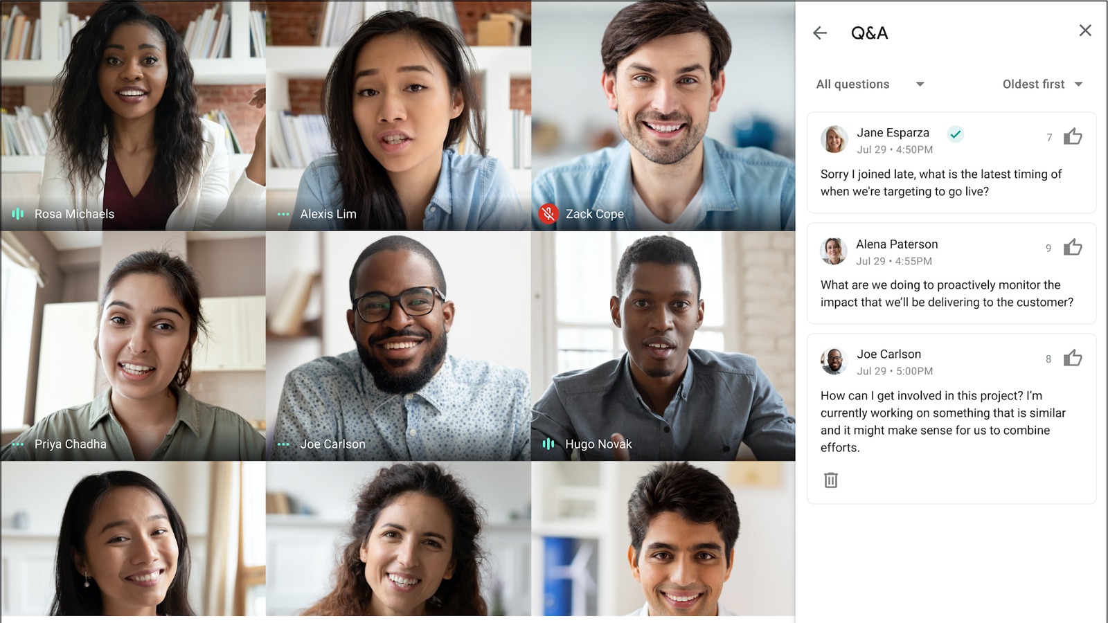 Функция Q&A позволяет запустить удобный чат, в который участники загружают вопросы, а модераторы выбирают некоторые из них и отвечают. Как отмечают разработчики, функция особенно полезна для учителей и в бизнесе.