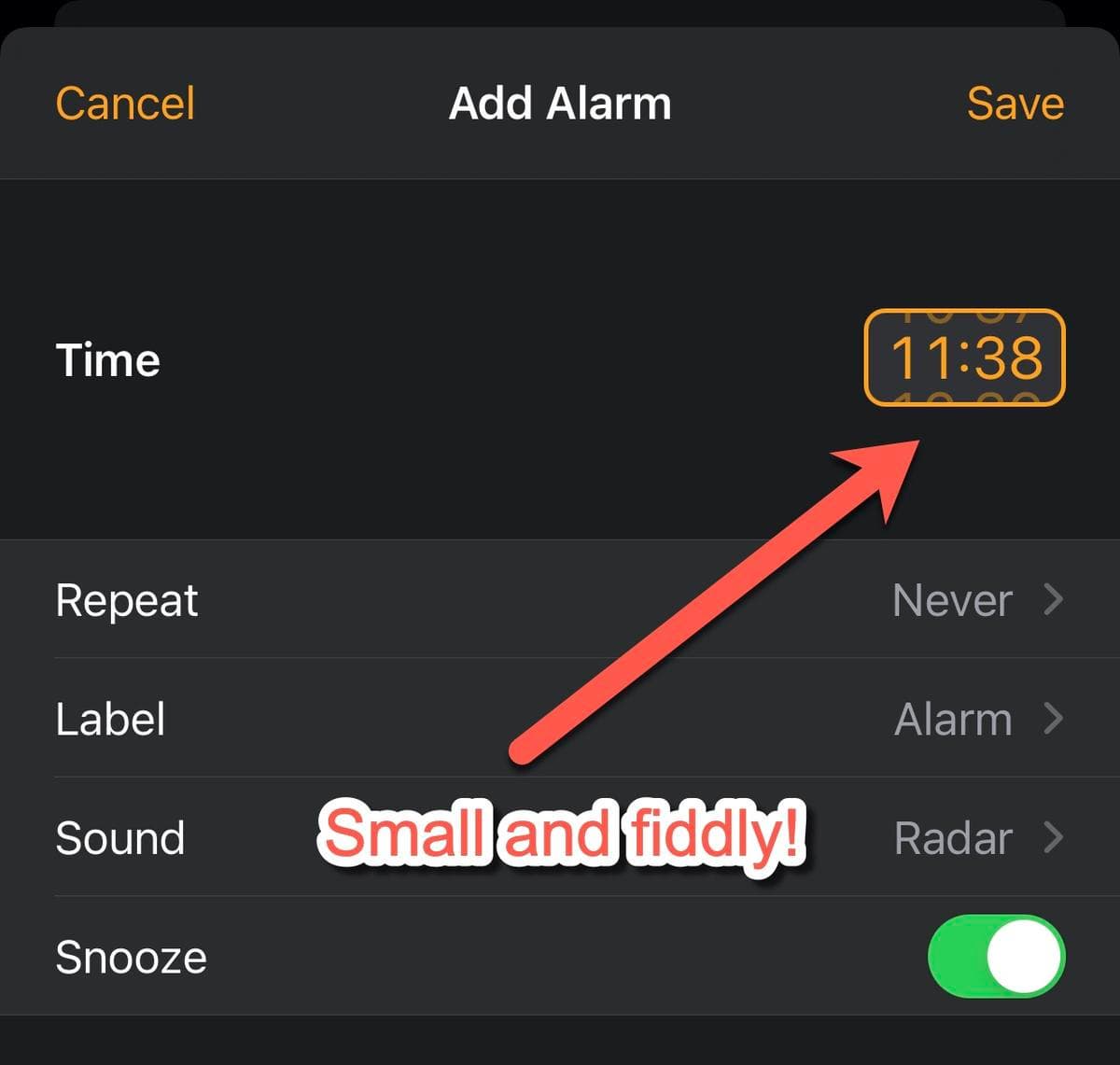 В качестве примера можно привести новую систему ввода времени с помощью небольшого окошка вместо старых колесиков прокрутки. Конечно, возможность ввести время с клавиатуры удобна, но ради этого не обязательно делать элементы мелкими и неудобными для сенсорного ввода.