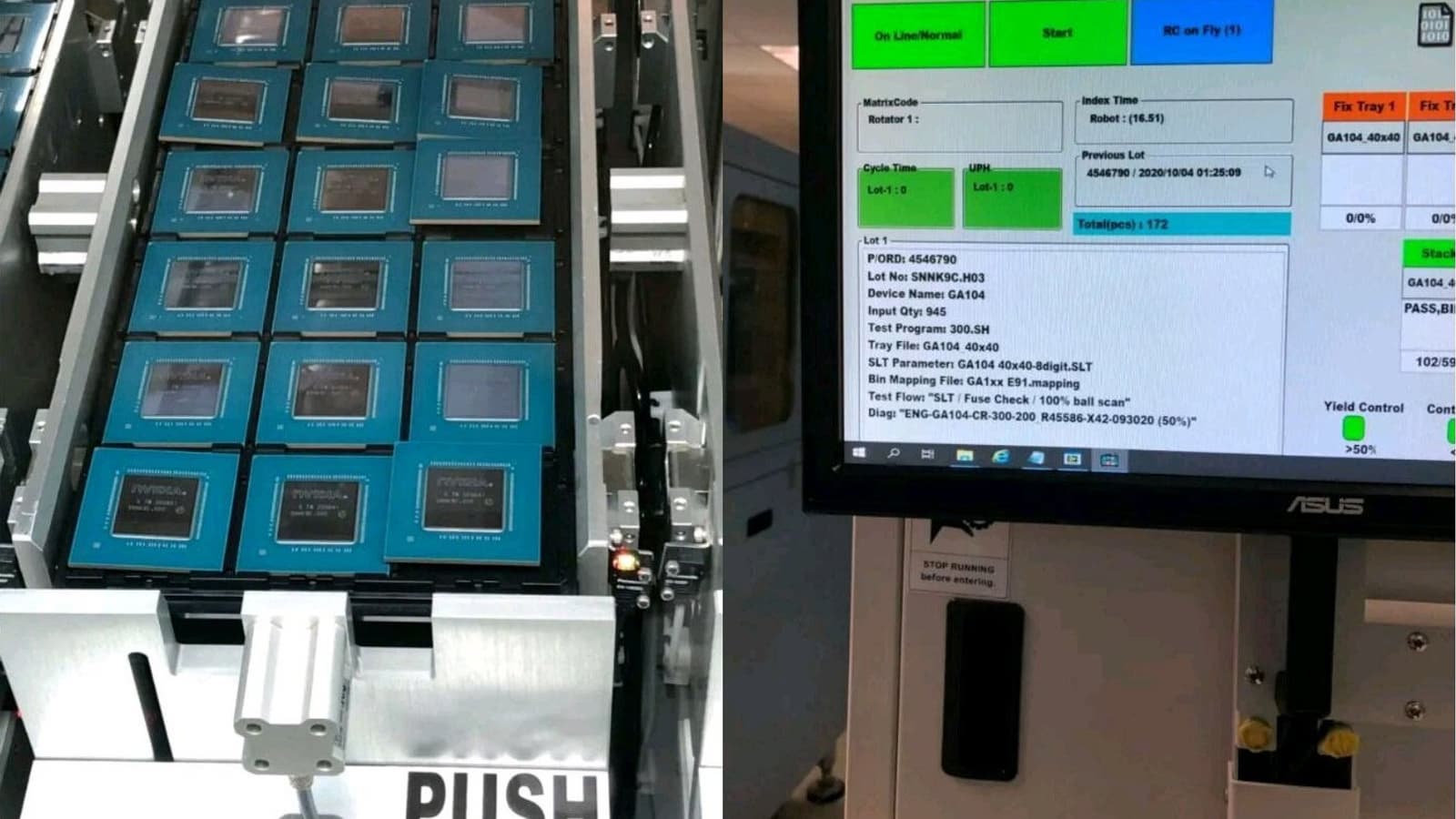 Производство GPU для видеокарты GeForce RTX 3070, судя по всему, идёт полным ходом. В Сеть попали фотографии GPU GA104, проходящих тестирование. Судя по всему, конкретно в случае RTX 3070 графический процессор будет называться GA104-300, тогда как полный вариант называется GA104-400, но пока он нигде использоваться не будет, если вообще когда-либо выйдет на рынок.