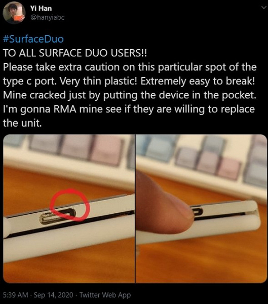 Несколько владельцев Surface Duo уже столкнулись с трещинами возле порта USB-C — это как раз то место, где толщина пластика крайне невелика. У кого-то корпус треснул во время подключения зарядного устройства, а у кого-то просто в кармане.