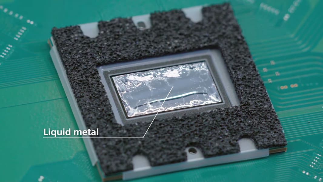 Внутри — системная плата, на которой распаяно все: и CPU, и GPU, и чипы памяти GDDR6 в количестве 8 штук, и чипы памяти SSD в количестве трех штук (они размещены на оборотной стороне). В качестве термоинтерфейса CPU используется так называемый жидкий металл — он обеспечивает лучшее отведение тепла в сравнении с обычным термоинтерфейсом.
