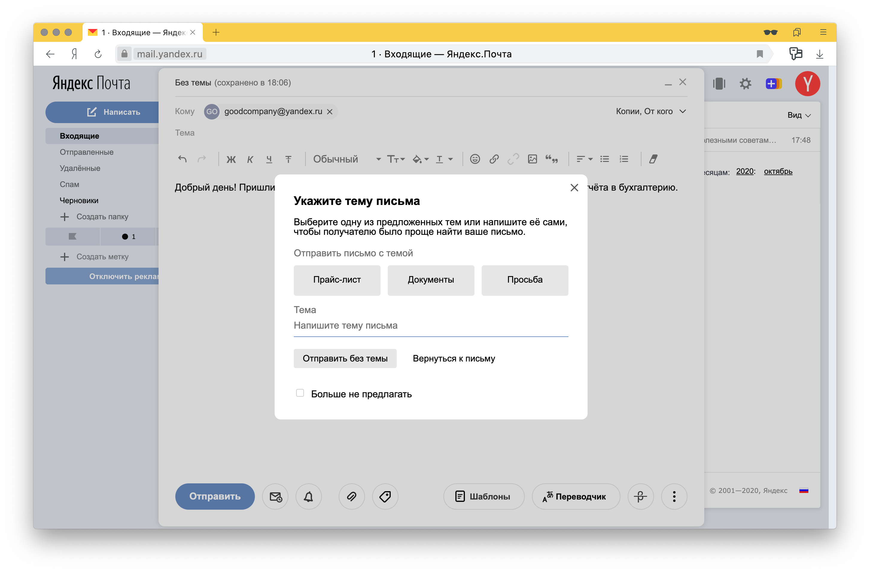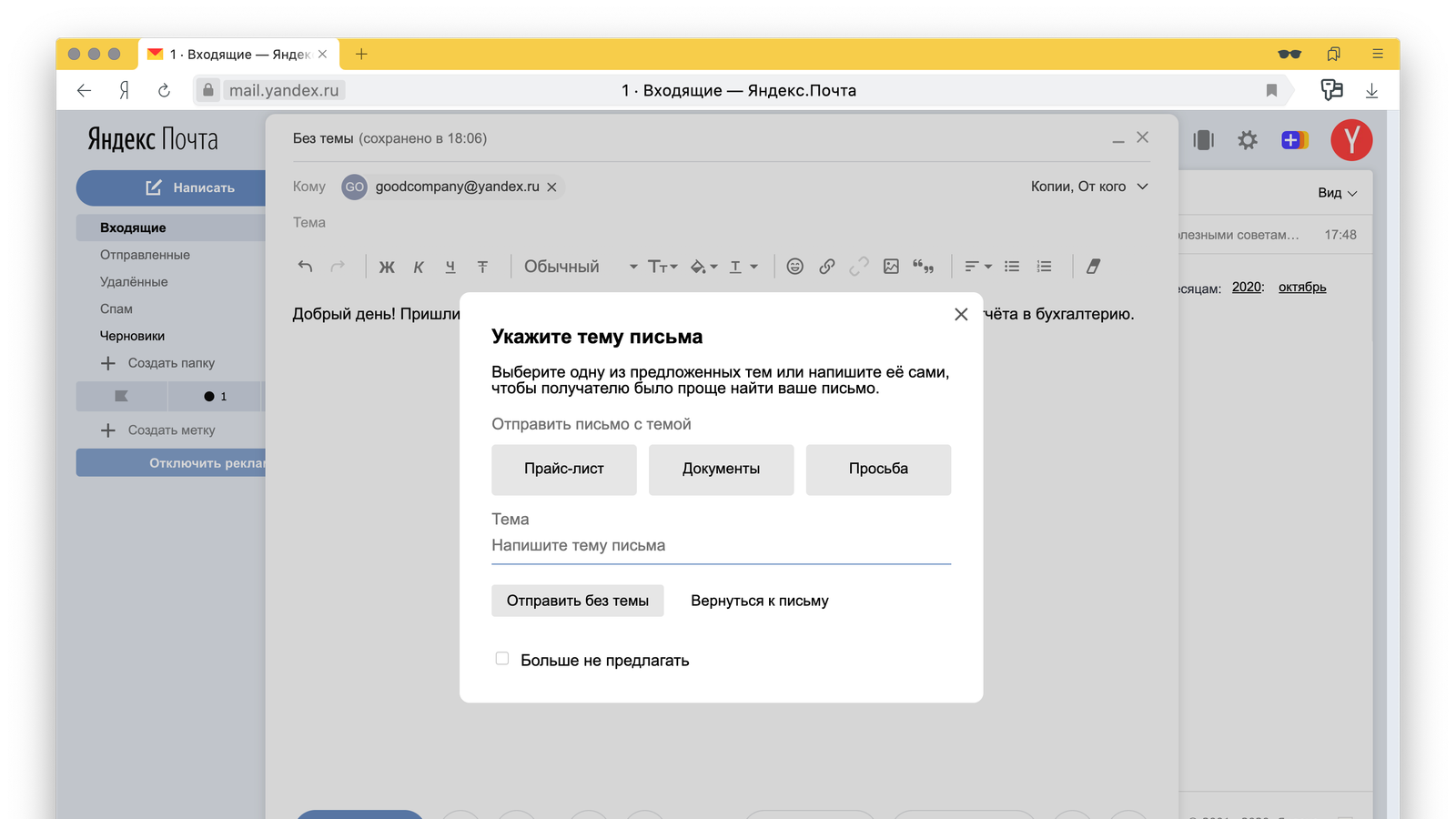 Теперь пользователям Яндекс.Почты 360 будет проще придумать тему письма. Специальные алгоритмы проанализируют его содержимое и предложат подходящие варианты — например, «Заказ» или «Договор». Ранее в обычной Яндекс.Почте появились подсказки, ускоряющие набор текста.