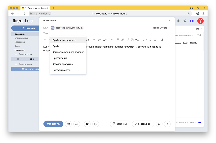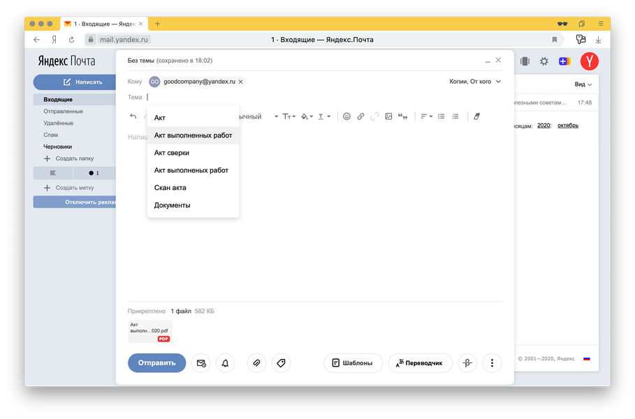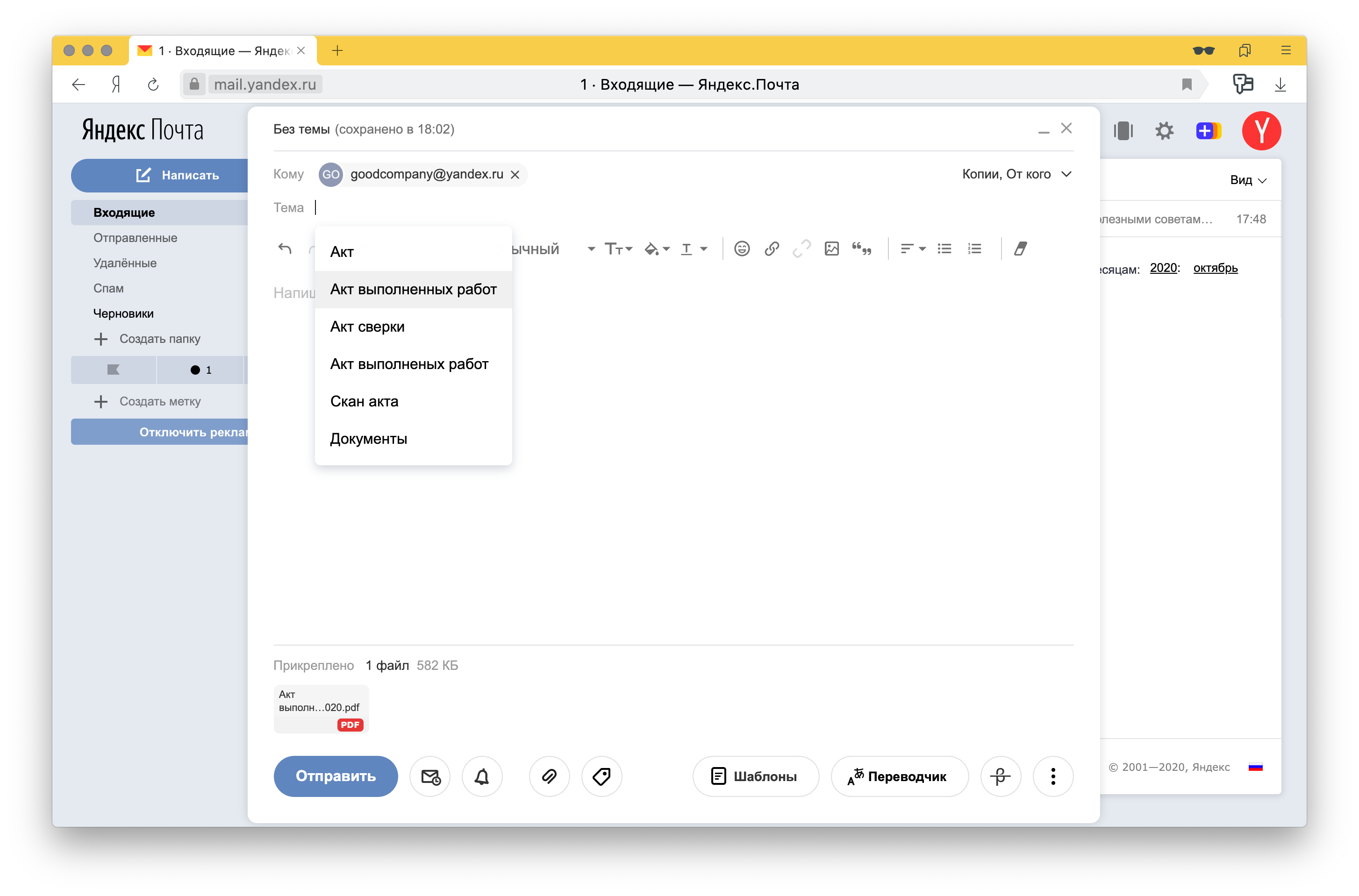 По данным Яндекса, около 20% писем люди отправляют без темы. Такие письма легко не заметить, а кроме того — их потом сложно найти. Чтобы избежать этого, Яндекс собрал коллекцию популярных тем: каждую из них использовали как минимум несколько десятков тысяч человек. Часто такие темы связаны с работой: например, «Заявка», «Акт сверки», «Коммерческое предложение».