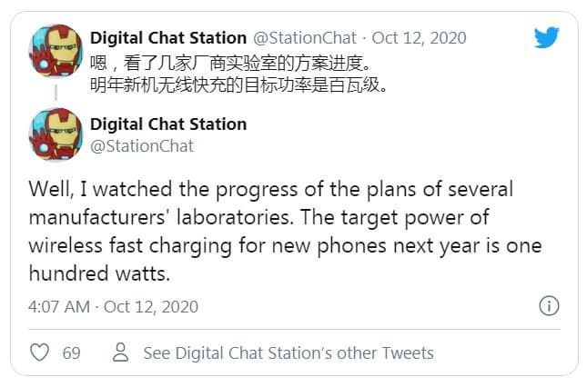 Инсайдер Digital Chat Station, неоднократно публиковавший подтверждавшуюся позже информацию о мобильных устройствах, утверждает, что производители разрабатывают новые решения для беспроводной зарядки смартфонов, поставив для себя целью на будущий год достичь мощности 100 Вт.