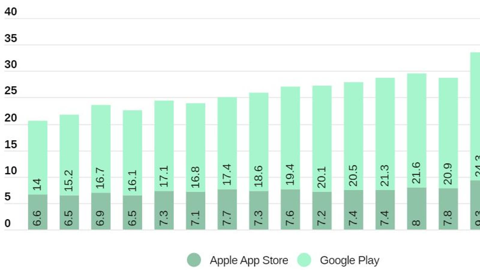 Google Play лидирует не только по количеству загрузок, но и представляет собой магазин с наибольшим количеством приложений. По состоянию на второй квартал 2020 года пользователи Android могли выбирать между 2,7 млн приложений, что на 5,85% больше, чем в предыдущем квартале. В Apple App Store насчитывается 1,82 млн приложений для iOS, что на 1,2% меньше, чем в первом квартале 2020 года. Следом идут Windows Store и Amazon Store с 669 000 и 450 000 доступных приложений соответственно.
