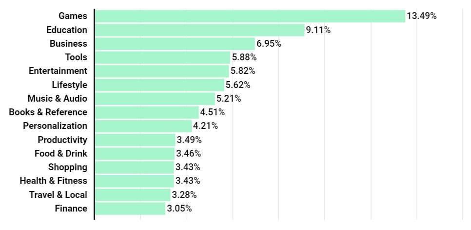 Статистика показывает, что игровые приложения были самой популярной категорией приложений в магазине Google Play во втором квартале 2020 года, составляя 13,49% доступных приложений. На втором месте оказались образовательные приложения с долей 9,11%. Далее следуют бизнес-приложения и инструменты с долями 6,95% и 5,98% соответственно. Наглядное представление о распределении приложений по категориям дает вторая диаграмма.