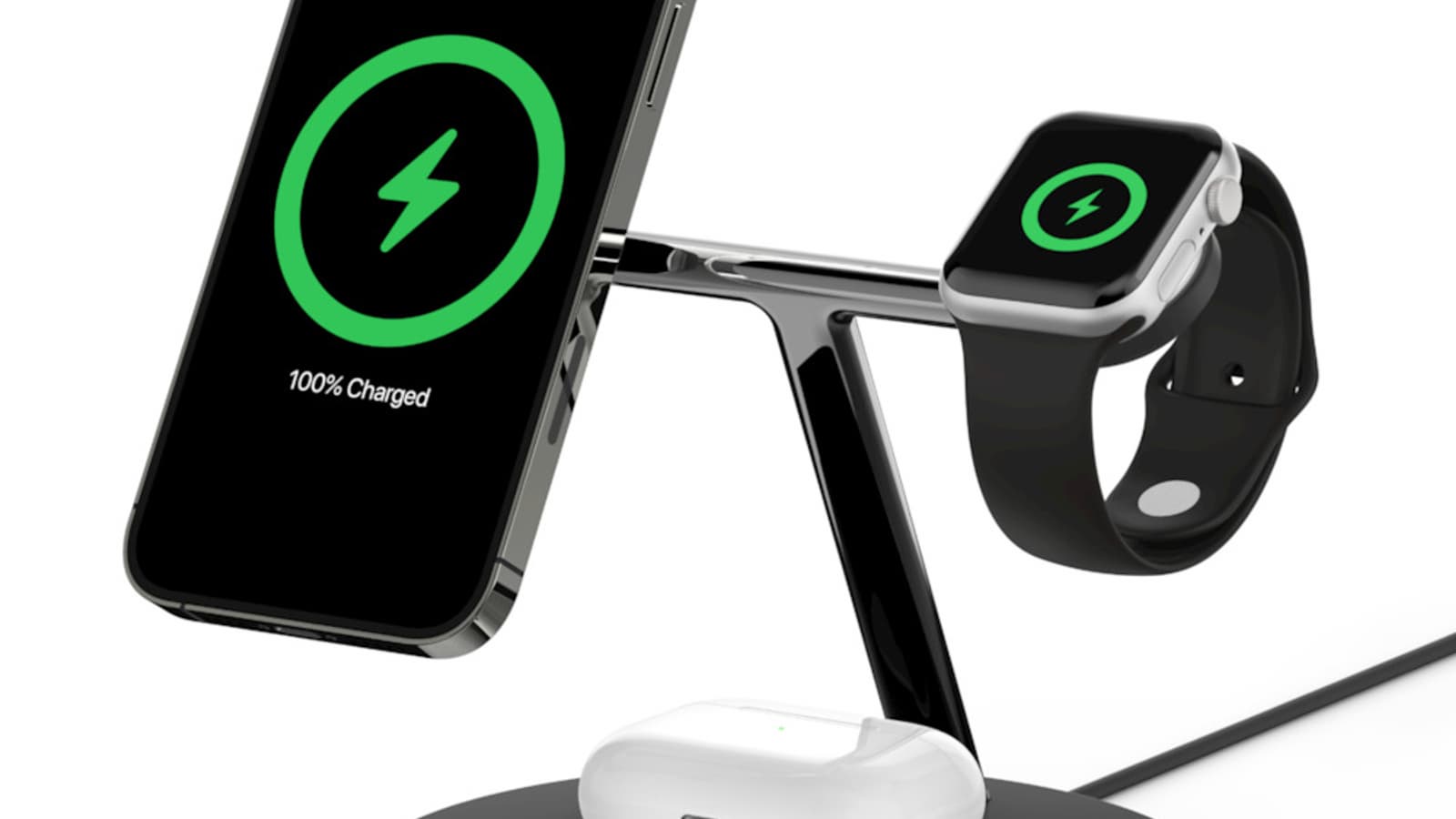 Это подставка для одновременной зарядки сразу трёх устройств: смартфона, умных часов и наушников. Фактически это как раз альтернатива так и не вышедшей AirPower. Новинка доступна в белом и чёрном цветах по цене 150 долларов.