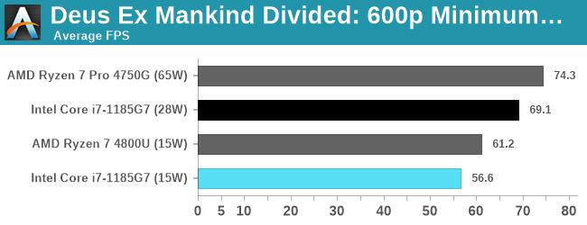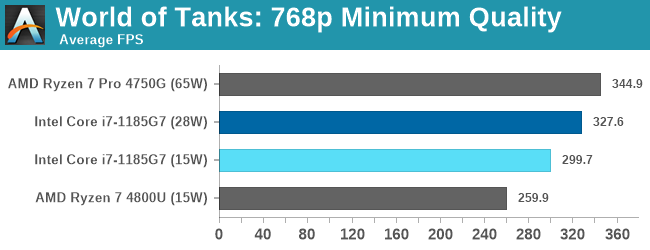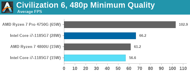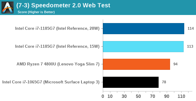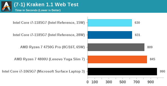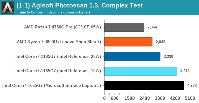 Обращает на себя внимание, что 15-ваттный Ryzen 4800U в среднем находится на уровне как с 15-ваттным Core i7-1185G7, так и с 28-ваттным. Но нужно учесть, что в тестах принимала участие референсная платформа Intel, результаты которой могут отличаться от серийных продуктов.
